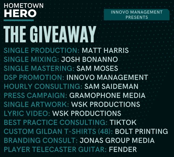 The winning Hometown Hero will be awarded the following prize package (valued at over $20,000) It is literally a song from beginning to end created and promoted by top industry individuals and companies as well as other perks such as merchandise and consulting, including: